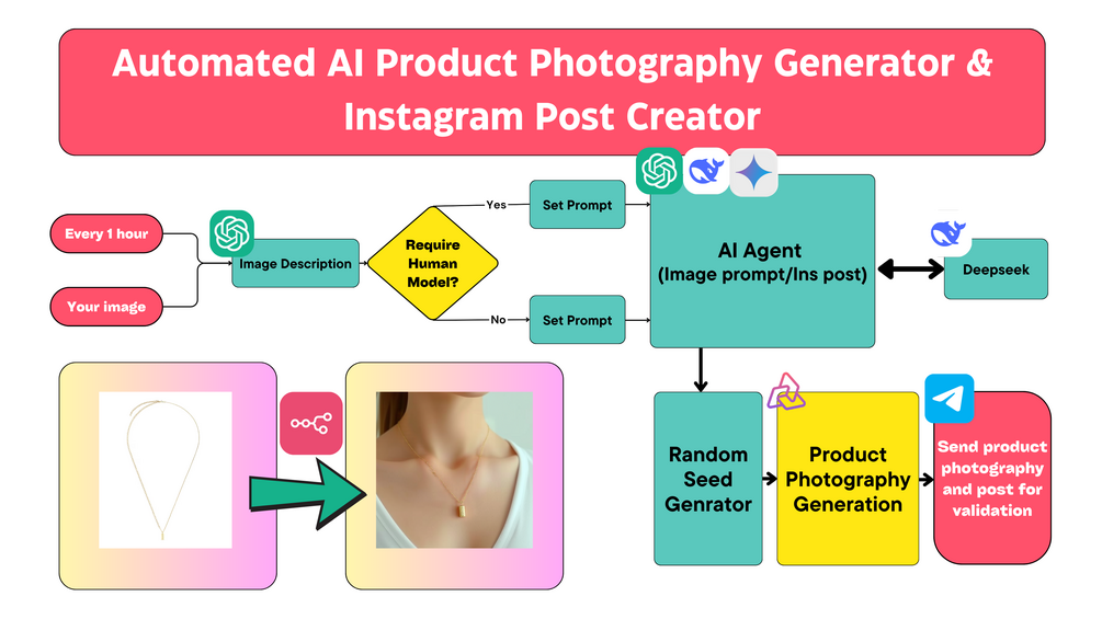 Tired of tedious product photoshoots and brainstorming Instagram content? This n8n workflow is your ultimate solution! Automatically generate professional-grade product photography and ready-to-use Instagram posts using the power of AI, delivered straight to your Telegram for approval.
